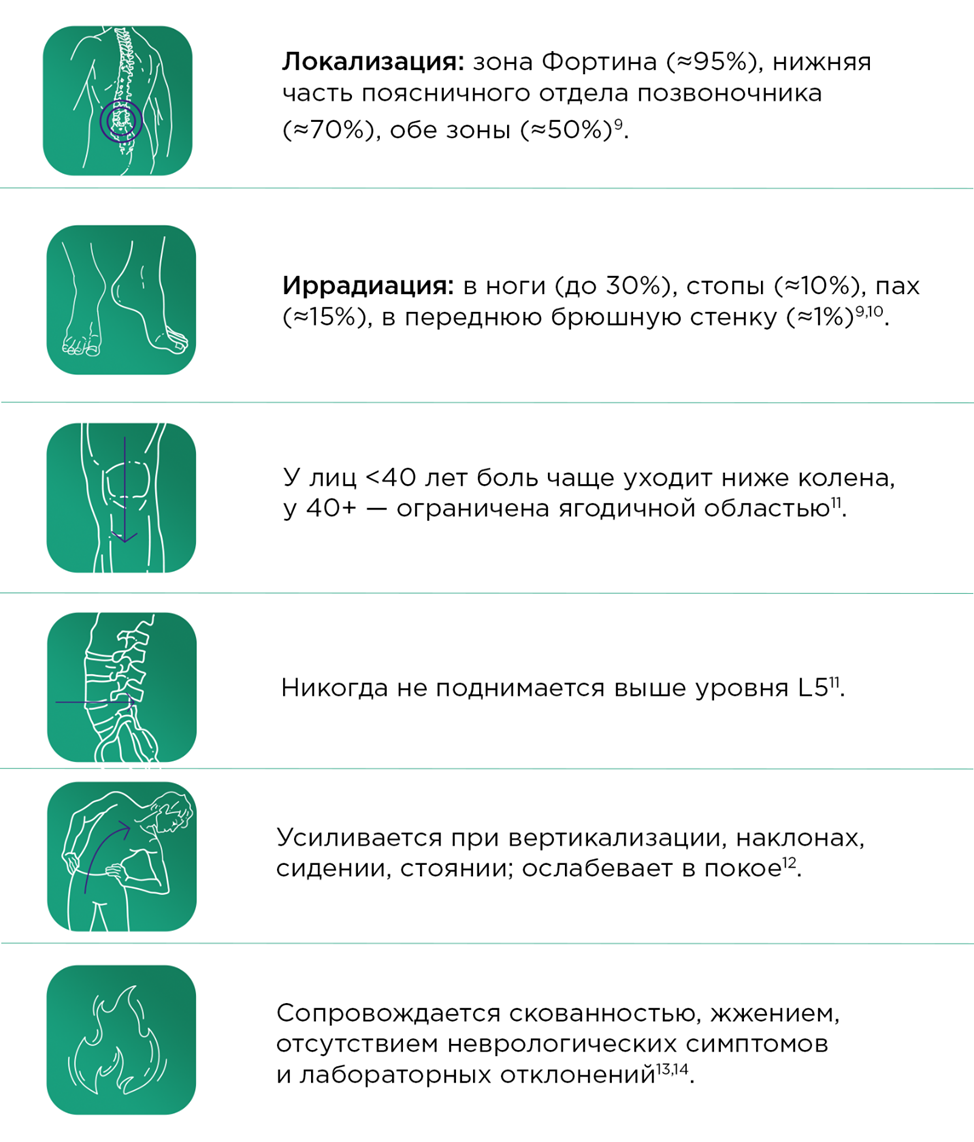 Боль при пальпации зоны Фортина (10 см ниже spina iliaca superior posterior — задней верхний подвздошной ости).