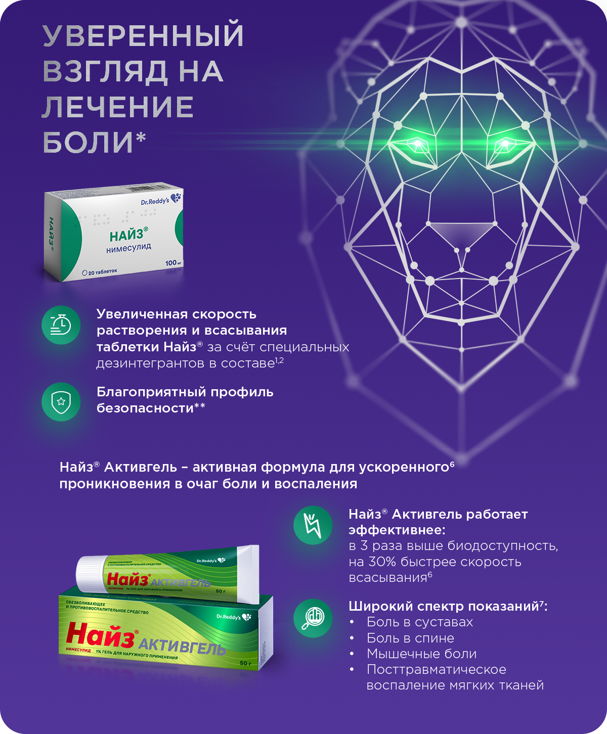Препарат Найз® (нимесулид) хорошо зарекомендовал себя за 25 лет клинического применения. В исследовании он начинал действовать уже через 15-20 минут после приема и обладал благоприятным профилем безопасности20. При умеренно выраженном болевом синдроме может использоваться местная форма — Найз Активгель.