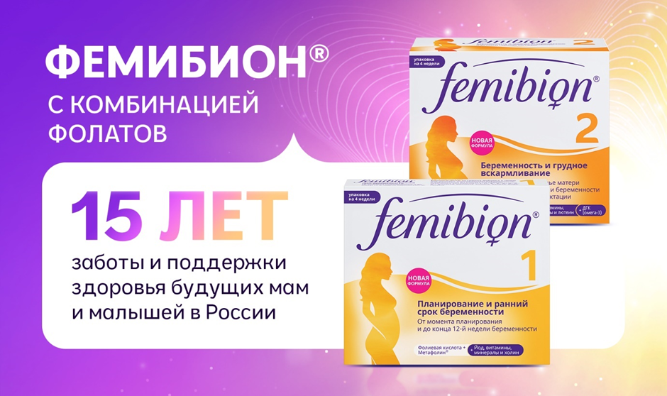 Универсальная рекомендация (при отсутствии противопоказаний) — комплексные пренатальные витамины. Фемибион® содержит оптимально подобранные дозы витаминов и микроэлементов, включая холин и активные формы фолатов7.