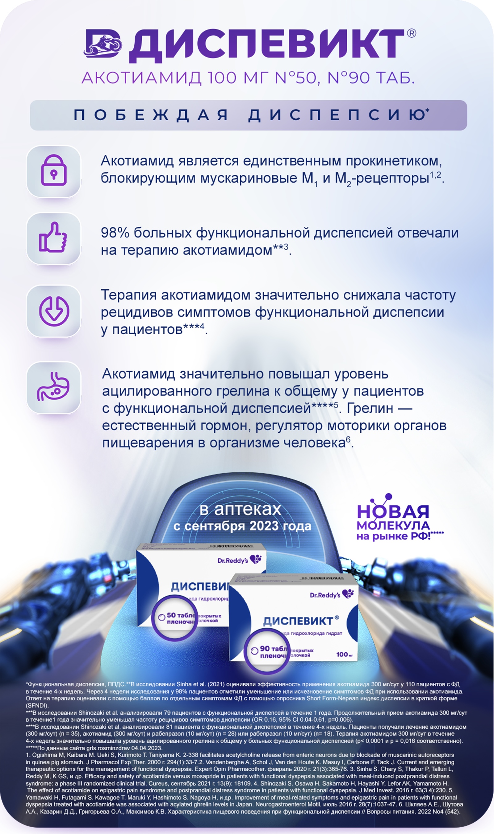 Там, где японские коллеги первыми внедрили акотиамид, российские врачи сегодня назначают Диспевикт® — современный препарат с доказанной эффективностью при ФД4.